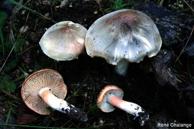 La especie tipo TRICHOLOMA SAPONACEUM, talla mayor (hasta 15), sombrero más verdoso y su carne solo enrojece ligeramente a rosado (no a rojo intenso).