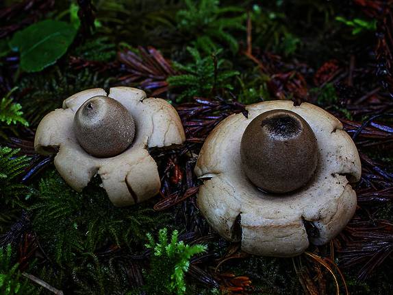 Desarrolla un exoperidio no higroscópico de 5-8 lacinias triangulares 3-5 cms., carnosas, curvadas hacia abajo, color crema-gris con 3 capas: micelial (lisa, sin aglomerar sustrato, cara externa afieltrada); fibrosa (papirácea de joven, inconsistente con humedad, color blanco-sucio); carnosa (blanca-ocre y tras madurar, gleba pardo-oscura).