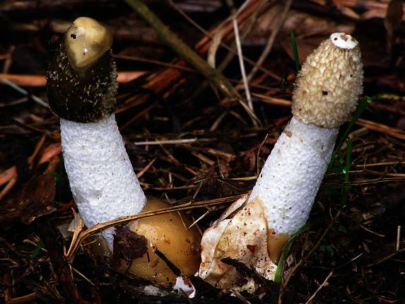 Al romper el huevo, crece un largo pie, enhiesto y blanco, de aspecto cavernoso, terminado en una gleba o caperuza de color oliváceo a negro.