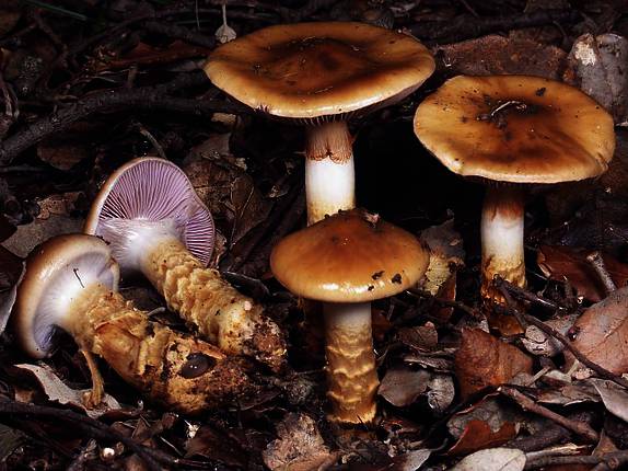 Subgénero Myxacium, Sección Myxacium. Color amarillento-ocráceo (se confunde con las hojas caídas de los robles). Sombrero inicialmente globoso de cutícula viscosa y separable de la carne. Láminas muy prietas, con lamélulas, de color gris azulado, que al esporar se tiñen de pardo. Pie recio con brazaletes circulares en forma de anillos múltiples más oscuros. Carne blanquecina, compacta, sin olor ni sabor. Pie macizo, con cortina blanca y densa, que dificulta observar las láminas.