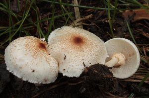 Sección: Stenesporae. Talla pequeña, <10. Sombrero blanco-crema con pequeño mamelón bien definido, color marrón o pardo rojizo y escamas concéntricas alrededor (más escasas en la periferia), color marrón, sobre fondo blanco.