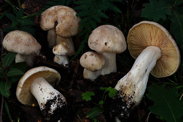 CALOCYBE GAMBOSA (más blanca o amarillenta, láminas apretadas) y otras especies con láminas blancas, no amarillas ni rosadas.